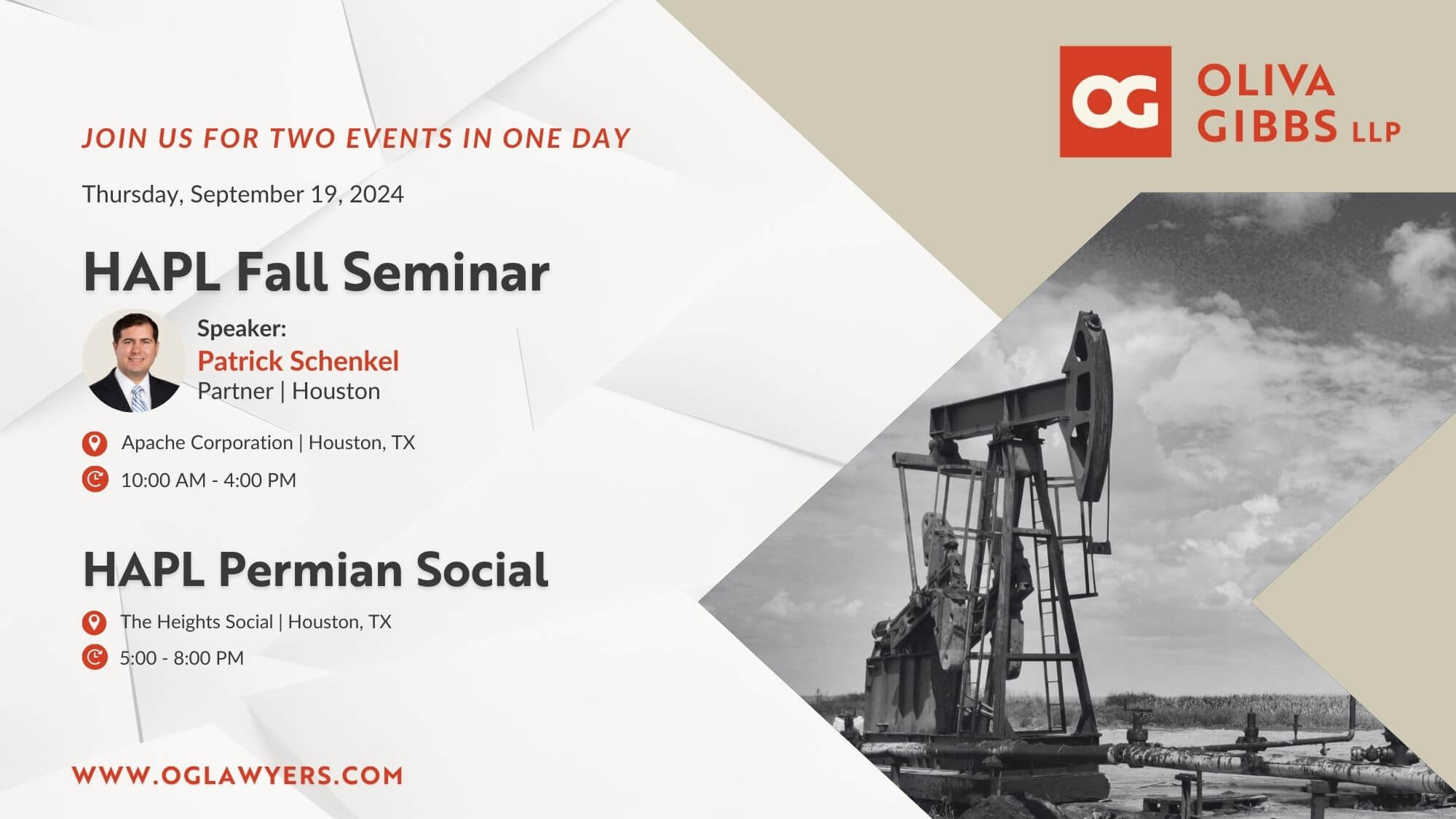 Oliva Gibbs is proud to partner with the Houston Association of Professional Landmen (HAPL) for an exciting day of learning, networking, and industry insights. On Thursday, September 19, 2024, we’re honored to be both sponsoring and actively participating in two important HAPL events.
