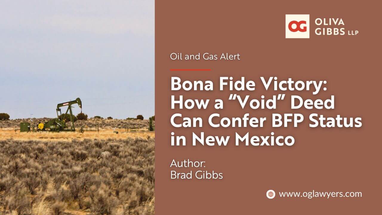 Bona Fide Victory: How a “Void” Deed Can Confer BFP Status in New Mexico August 2024 - On June 28, 2024, the Texas Supreme Court upheld the Railroad Commission's denial of Ammonite Oil's forced pooling request, emphasizing the importance of fair offers and actual drainage under the Texas Mineral Interest Pooling Act. Read More »